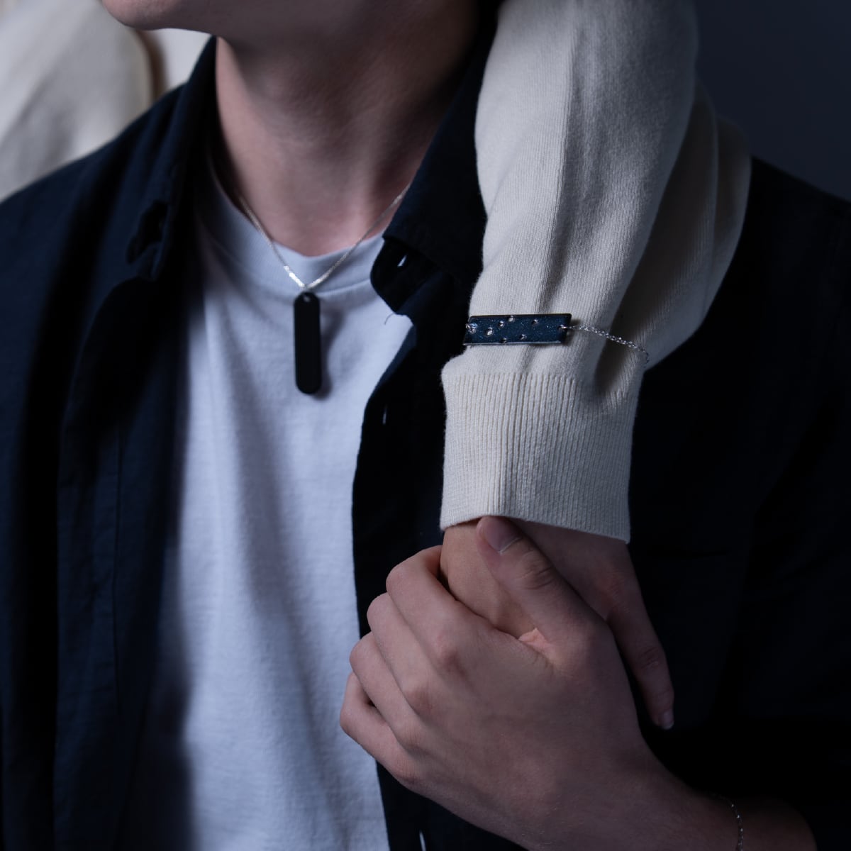 性別や世代を問わず楽しめるユニセックスなデザインで、大切な方とのペア使いにもおすすめです。ブレスレットチェーンは経年変化を楽しむことができるシルバー素材を採用。カラーは、夜空に瞬く星のきらめきをイメージして散りばめた「スパークルブラック」。上品で深みのあるブラックが、洗練されたデザインを引き立てます。